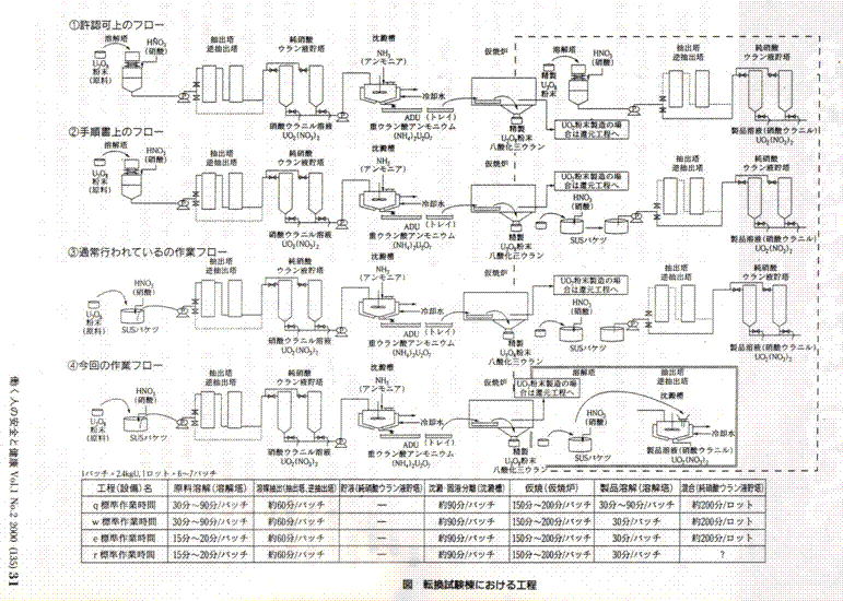 作業工程は転換試験棟で行われていたが、本来はウラン2.4sずつを硝酸に溶かし、 不純物をとるために、形状管理された溶解槽に入れ、 臨界を防止するために抽出塔、貯塔を通して沈殿槽に入れて、仮焼炉を経て八酸化三ウランとする。 「常陽」の燃料はできた八酸化三ウランをさらに硝酸に溶解して、 溶解槽、抽出塔、貯塔を経て液体硝酸ウラニルの形状で出荷する(図の@参照)。 この工程で科学技術庁の設置許可を得ていた。